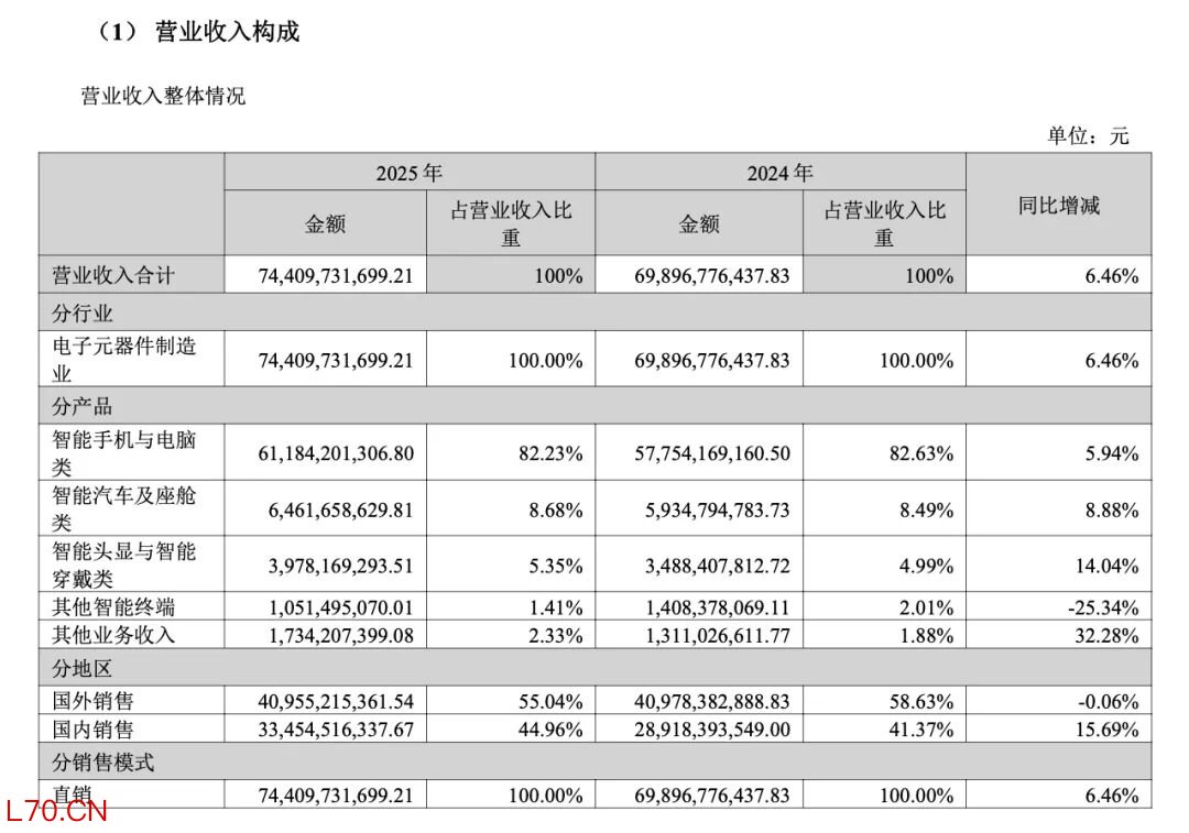 从2025年年报来看,蓝思科技来自智能汽车及座舱类的营收占比8.68%,智能头显与智能穿戴类营收占比5.35%,其他智能终端与其他业务收入合计占比约4%,从结构来看与2024年相比并没有出现显著变化。
