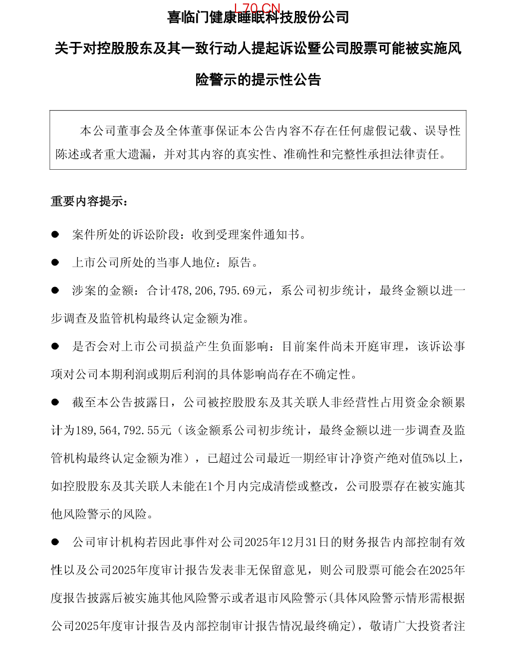 喜临门称,鉴于控股股东及其关联方非经营性资金占用损害公司利益的行为,公司及时向控股股东及其一致行动人提起诉讼。公司也将持续保持与控股股东及其一致行动人的沟通,督促其尽快通过现金偿还、资产置换、股票减持等方式解决资金占用问题,并积极推动本次诉讼进展,以维护公司及中小股东的利益。