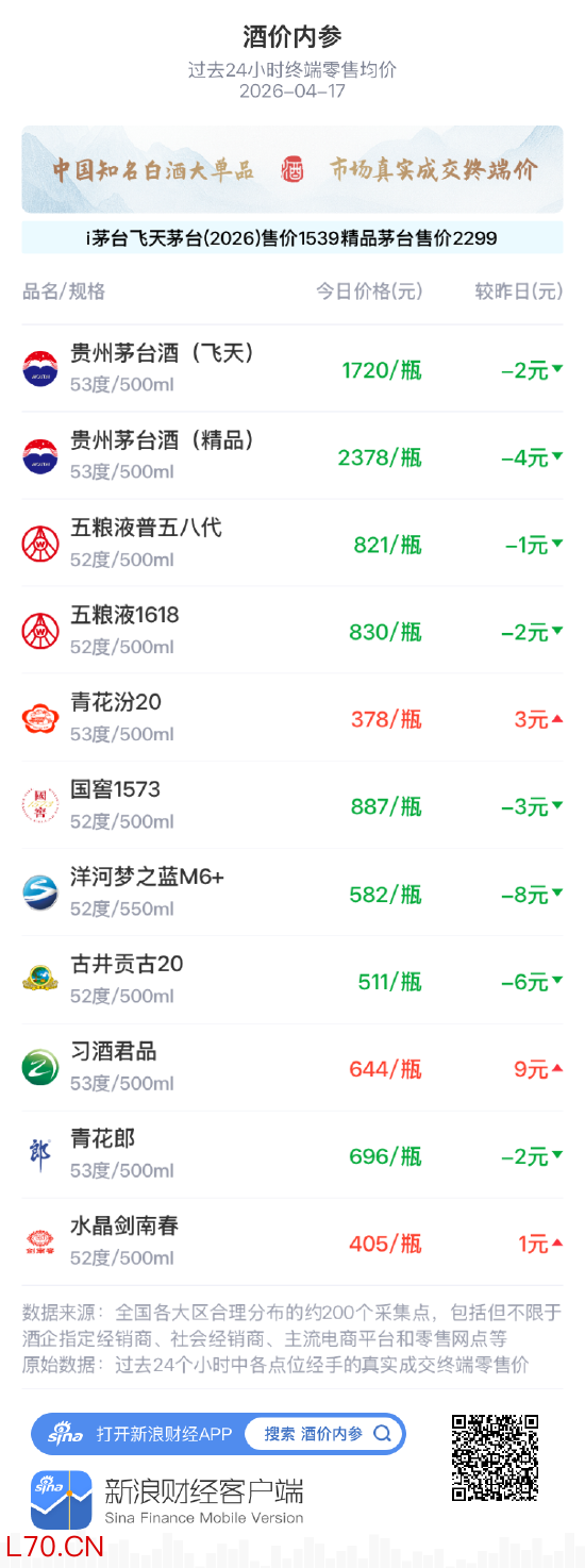 新浪财经“酒价内参”过去24小时收集的数据显示,中国白酒市场主要单品的终端零售均价在4月17日整体继续回落。如果主要单品各取一瓶整体打包售卖配资查询哪个靠谱,今日总售价为9852元,较昨日下跌15元,连续第三天创下近一个月新低。市场整体价格延续低位运行,终端交投表现平稳偏弱。