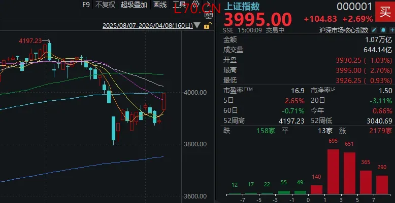 4月8日,市场集体反弹,沪指百点长阳,创业板指涨近6%、科创50指数涨超6%。截至收盘,沪指涨2.7%,深成指涨4.79%,创业板指涨5.91%。