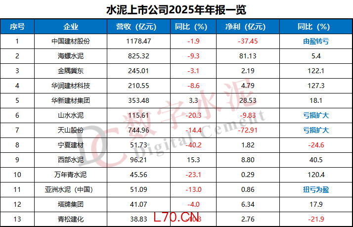 截止目前,水泥行业上市公司陆续发布了2025年年度报告。根据十三家公司发布的年报显示,营收下降、净利润增长的有六家,分别是海螺水泥、金隅冀东、华润建材科技、万年青水泥、亚洲水泥、塔牌集团。其中,2025年营收和净利润同比双双增长的有两家,分别是华新建材集团和西部水泥。