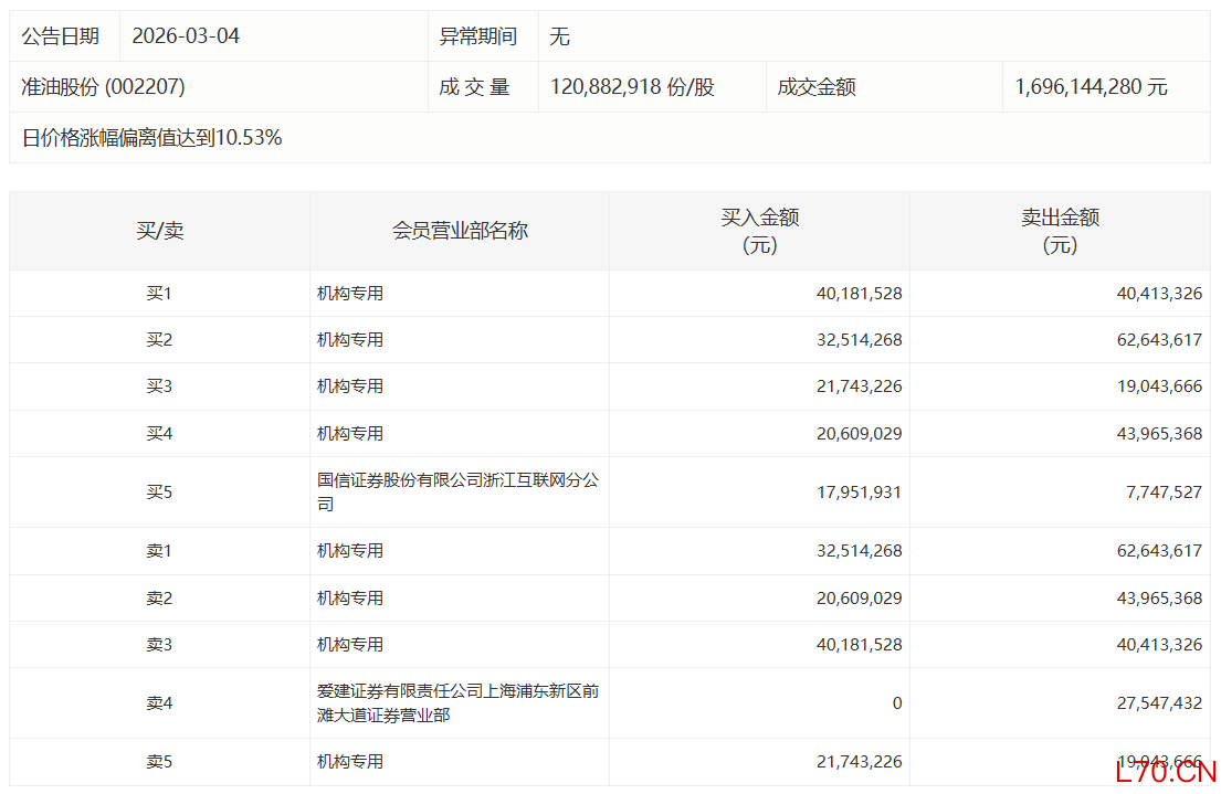 准油股份今日涨停,有3家机构专用席位净卖出5371.75万元