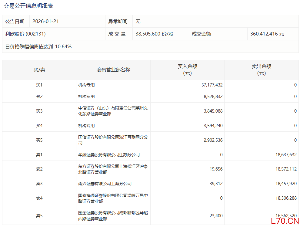 利欧股份今日跌停,3家机构专用席位净买入6930.05万元