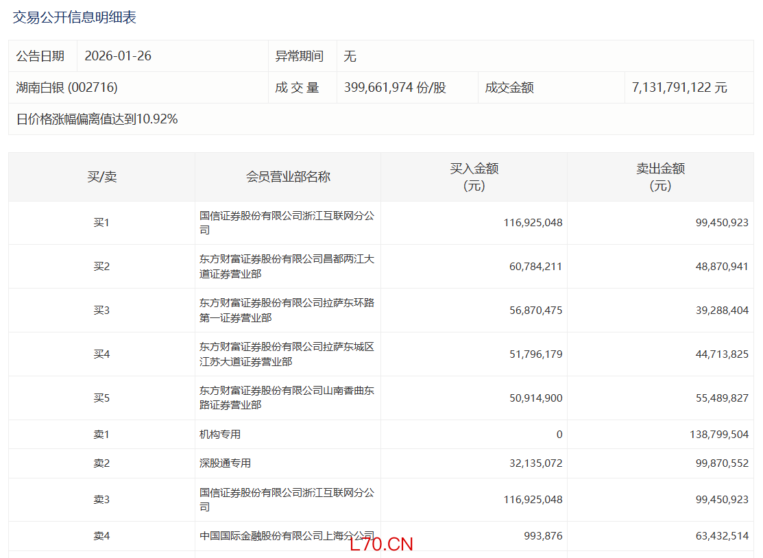 湖南白银今日涨停,有1家机构专用席位净卖出1.39亿元