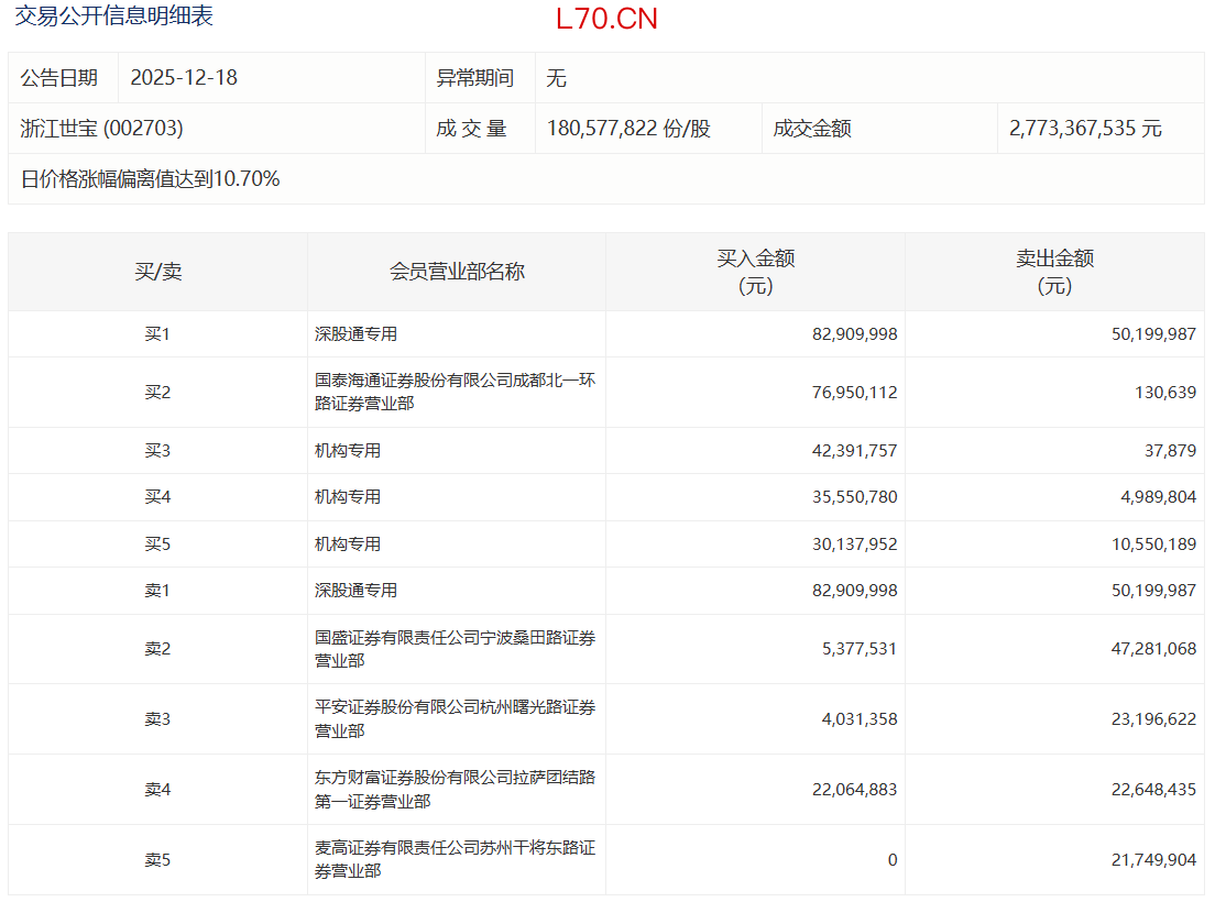 浙江世宝今日涨停 3家机构专用席位净买入9250.26万元