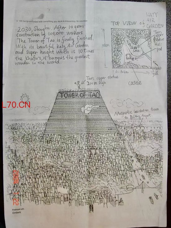 汪滔:我给你看一张我 2002 年画的图。是我当时申请加州理工大学,对方出的题,“Fill the space below with something you think it‘s interesting,be creative。” 我就画了这么个东西:上海的高楼林立中,耸立着一座巨型金字塔,顶端是空中花园,有瀑布、森林、环湖赛道,还有停机坪。